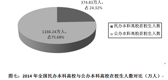 2014年,全国民办高校(含独立学院)共有728所,在校生587.15万人,其中,民办专科在校生212.28万人,占全国专科在校生总数的21.09%;民办本科在校生374.83万人,占全国本科在校生总数的24.32%(见图七)。另外,5所率先获得研究生招生资格的民办高校共有硕士研究生在校生408人。